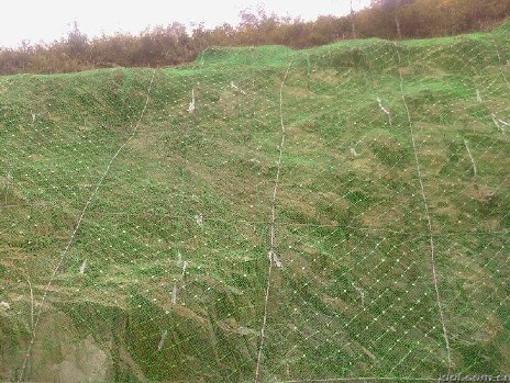 SNS柔性钢丝绳网材料:采用?8的钢丝绳(抗拉强度为1770Mpa,破断拉力>40KN)编制并在结点处用专用“十字扣”固定而成,为防护网的主要特征构件之一,在主动防护中通过钢丝绳网的覆盖来实现边坡的加固,其开放特征可以实现对坡面天然植被和植被生长条件的最佳保护,实现环境保护与灾害治理的有机结合;在被动防护系统中,其柔性特征充分体现了“以柔克刚”的思想,实现崩塌落石的有效拦截。